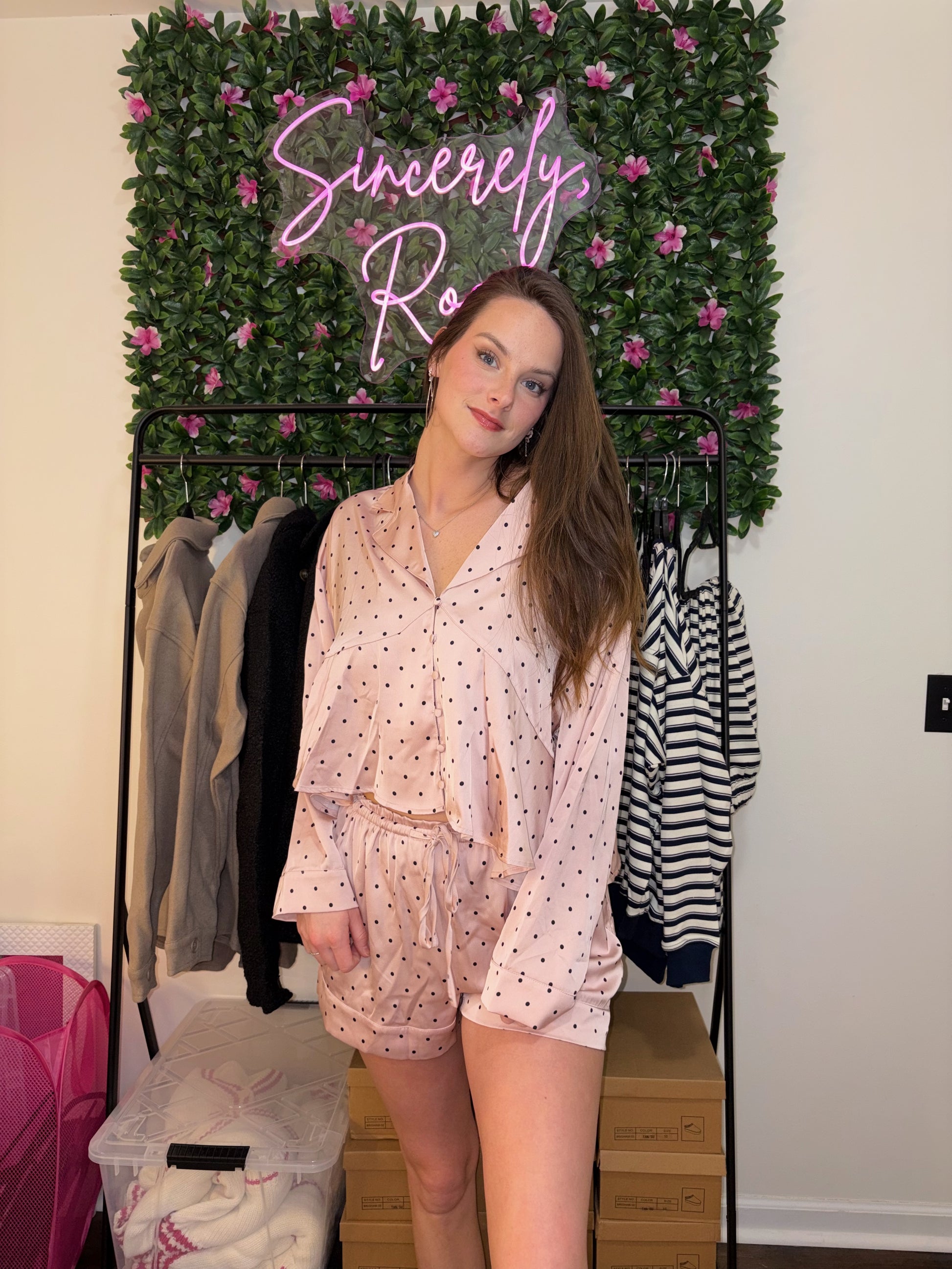 - Two-piece pajama set in a soft blush pink with polka dot print🩷