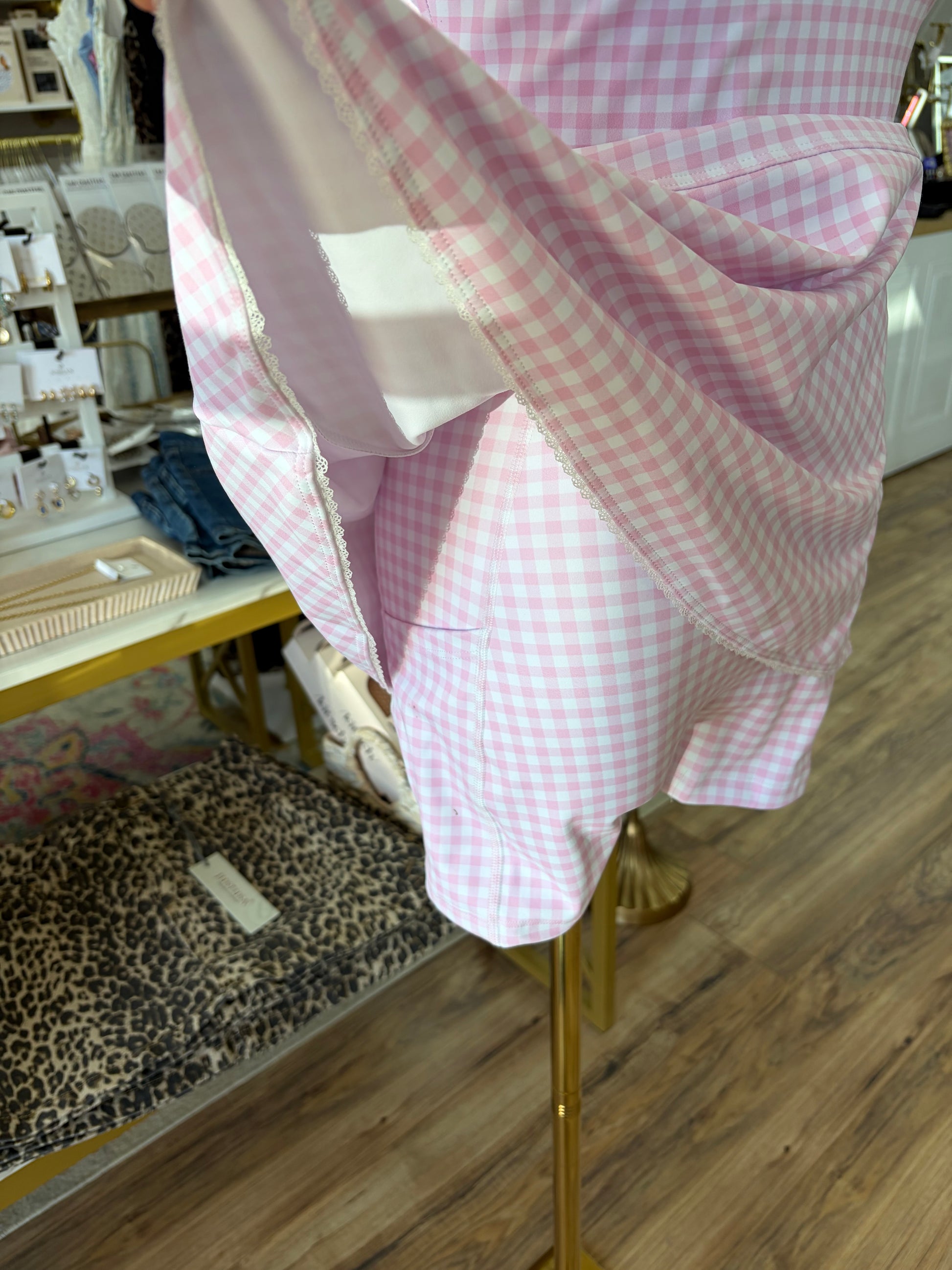 - Pink gingham print mini dress
